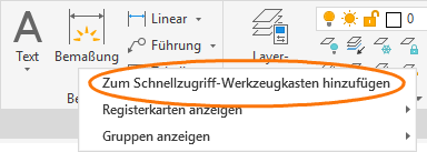 Schaltflächen werden rechts neben den Vorgabebefehlen im Schnellzugriff-Werkzeugkasten hinzugefügt. Um einen dieser Befehle zu entfernen, verwenden Sie den CUI-Editor, und öffnen Sie [+] Schnellzugriff-Werkzeugkästen > [+] Schnellzugriff-Werkzeugkasten 1. Dort können Sie klicken und die ENTF-Taste drücken. Außerdem können Sie die Elemente ziehen, um ihre Reihenfolge im Werkzeugkasten zu ändern.
