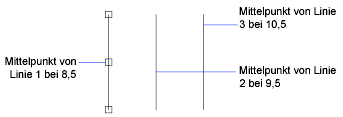 Wenn Sie die Taste STRG gedrückt halten, um mit dem Zeigegerät mehrere Kopierpunkte auszuwählen, fängt der Grafik-Cursor einen Versatzpunkt, der auf den letzten beiden von Ihnen gewählten Punkten basiert. In der nachfolgenden Abbildung befindet sich der Mittelpunkt der Linie 1 auf der Koordinate 8,5. Ausgehend von diesem Mittelpunkt wurde die Linie 2 kopiert, wobei die Taste STRG und der Griffmodus Strecken verwendet wurden; der Mittelpunkt befindet sich bei 9,5. Die dritte Linie fängt einen Versatz, der auf den Koordinatenwerten 10,5 beruht.