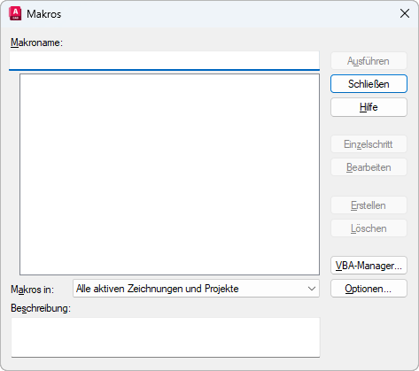 Gibt das Projekt oder die Zeichnung an, dessen bzw. deren Makros in der Makroliste zur Verfügung stehen. Wenn das Projekt oder die Zeichnung nicht aufgeführt ist, klicken Sie zum Laden auf VBA-Manager.