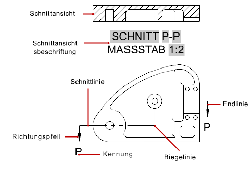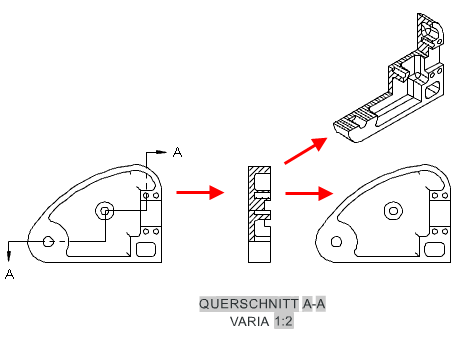 Komponenten, die von der Schnittlinie geschnitten werden, sind in der Schnittansicht schraffiert. Die Entwurfsverfahren im Maschinenbau erfordern, dass Komponenten, wie z. B. Schrauben und Wellen nicht schraffiert (geschnitten) werden.