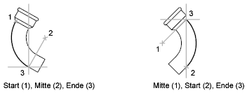 Der Abstand zwischen dem Startpunkt und der Mitte bestimmt den Radius. Der Endpunkt wird durch eine Linie bestimmt, die von der Mitte aus durch den dritten Punkt verläuft.