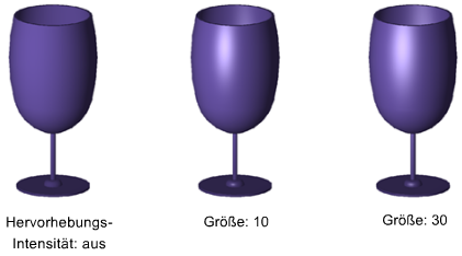 Die Größe der Glanzlichter eines Objekts beeinflusst die Wahrnehmung des Glanzes. Ein kleiner, intensiver Glanzpunkt lässt die Objekte glänzender wirken. Die Hervorhebungsintensität, die in einem visuellen Stil festgelegt wird, wirkt sich nicht auf Objekte aus, denen Materialien zugewiesen sind.