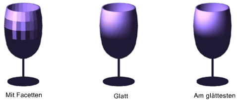 Bei der Beleuchtung mit Facetten wird eine einzelne Farbe für jede Fläche berechnet. Einzelne Flächen scheinen flach zu sein. Mit der Option Weiches Licht werden die Kanten zwischen Polygonflächen geglättet, indem die Farben als Abstufung zwischen Scheitelpunkten der Flächen berechnet werden. Die Objekte erscheinen glatter.