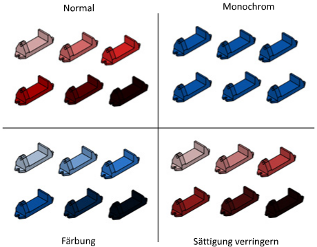 Lassen Sie Flächenfarben auf normale Weise anzeigen, oder geben Sie einen Flächenfarbmodus an. Monochrom zeigt die Flächen in den verschiedenen Schattierungen einer bestimmten Farbe an. Tönung schattiert Flächen, indem der Farbton und die Sättigungswerte basierend auf einer bestimmten Farbe geändert werden. Die Sättigungsverringerung hellt die Farben auf.