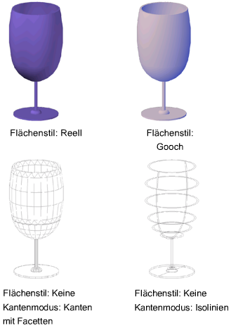 Der Flächenstil definiert die Schattierungen auf einer Fläche. Durch den Stil Realistisch (unten links) soll eine realistische Darstellung erzielt werden. Mit Gooch (unten rechts) können Details besser wiedergegeben werden, indem der Kontrast zwischen beleuchteten und schattigen Bereichen verringert wird. Für beleuchtete Bereiche werden warme Töne verwendet, für schattierte Bereiche kühle Töne.
