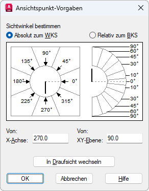Legt die Ansichtsrichtung relativ zum Weltkoordinatensystem (WKS) oder zu einem Benutzerkoordinatensystem (BKS) fest.