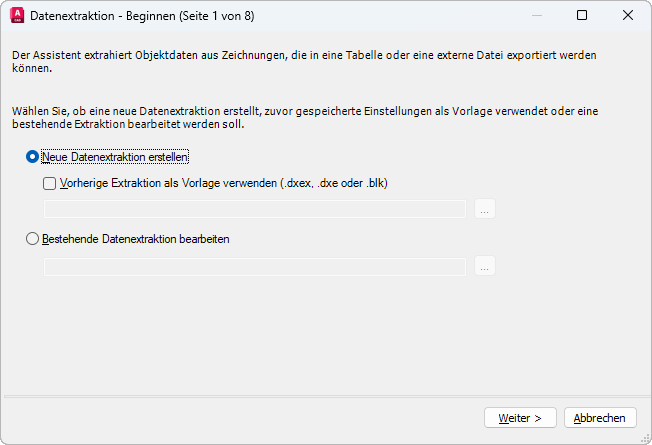 Erstellt eine neue Datenextraktion und speichert sie in einer DXEX-Datei. Außerdem können Sie eine vorhandene Datenextraktionsdatei (BLK, DXE oder DXEX) angeben, die als Vorlage dienen soll.
