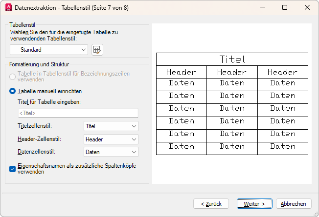 Steuert das Erscheinungsbild der Datenextraktionstabelle. Diese Seite wird nur angezeigt, wenn Sie auf der Seite Ausgabe wählen die Option AutoCAD-Tabelle ausgewählt haben.