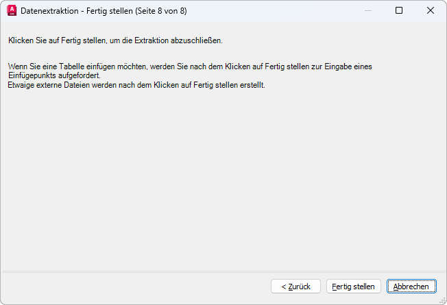 Erstellt eine Tabelle, die die extrahierten Daten enthält. Sie werden aufgefordert, die Tabelle in die aktuelle Zeichnung einzufügen, wenn Sie auf der Seite Fertig stellen auf Fertig stellen klicken.