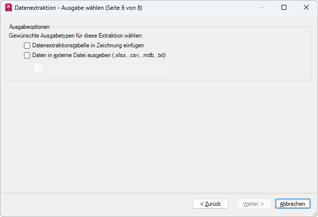 Gibt die zu extrahierenden Objekttypen (Blöcke und Nicht-Blöcke) und Informationen zur Zeichnung an.