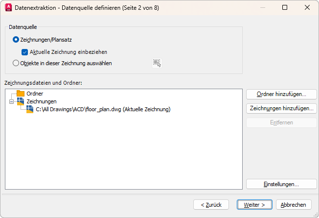 Öffnet das Standarddialogfeld zur Dateiauswahl, in dem Sie Zeichnungen angeben können, die in die Datenextraktion einbezogen werden sollen.