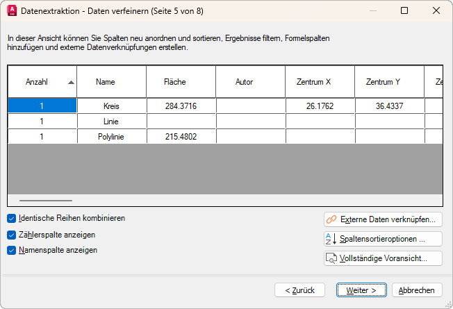 Anhand dieser Informationen wird in der aktuellen Zeichnung und/oder in einer externen Datei eine Datenextraktionstabelle erstellt.