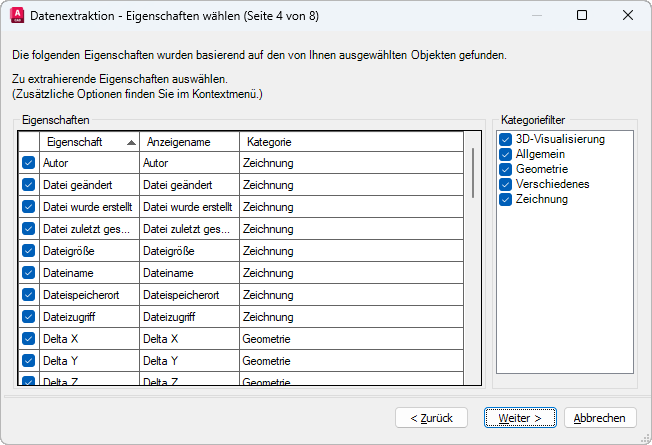 Steuert die zu extrahierenden Objekt-, Block- und Zeichnungseigenschaften.