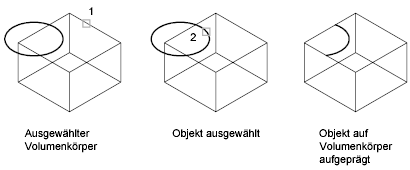 Prägt ein Objekt auf den ausgewählten Volumenkörper auf. Das aufgeprägt Objekt muss eine oder mehrere Flächen am ausgewählten Volumenkörper schneiden, damit das Aufprägen erfolgreich vorgenommen werden kann. Die folgenden Objekte können durch Aufprägen bearbeitet werden: Bogen, Kreise, Linien, 2D- und 3D-Polylinien, Ellipsen, Splines, Regionen, Körper sowie 3D-Volumenkörper.