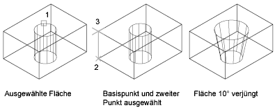 Verjüngt Flächen an einem 3D-Volumenkörper in einem festgelegten Winkel. Die Drehung des Verjüngungswinkels ergibt sich aus der Reihenfolge bei der Auswahl des Basispunkts und des zweiten Punkts entlang des ausgewählten Vektors.