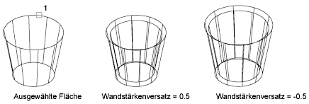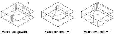 Versetzt Flächen gleichmäßig um einen angegebenen Abstand oder durch einen bestimmten Punkt. Bei positiven Werten wird Größe oder Volumen des Volumenkörpers erhöht Bei negativen Werten wird Größe oder Volumen des Volumenkörpers verringert.