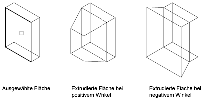 Ein positiver Winkel verjüngt die Fläche einwärts, ein negativer auswärts. Mit dem Vorgabewinkel 0 extrudieren Sie eine Fläche lotrecht zur Ebene. Alle ausgewählten Flächen im Auswahlsatz werden zu demselben Wert verjüngt.