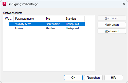 Listet die Griffe in der dynamischen Blockdefinition auf. Ein Häkchen in der Spalte Wechselnd weist darauf hin, dass für diesen Griff ein Wechsel aktiviert ist.