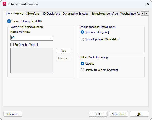 Wendet die Spurverfolgungseinstellungen in Objektfangspuren an. Wenn Sie Objektfangspuren verwenden, verfolgt der Cursor die Spur entlang der Ausrichtungswinkel von aufgerufenen Objektfangpunkten. (Systemvariable POLARMODE)