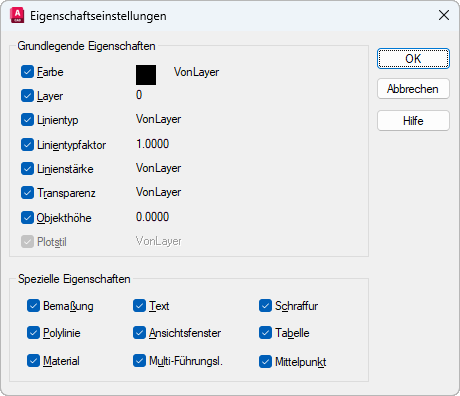 Ändert zusätzlich zu den grundlegenden Objekteigenschaften die Schraffureigenschaften (einschließlich der Beschriftungseigenschaften) des Zielobjekts in die des Quellobjekts. Um den Schraffurursprung abzustimmen, verwenden Sie Eigenschaften anpassen in SCHRAFF oder SCHRAFFEDIT. Nur für Schraffurobjekte.