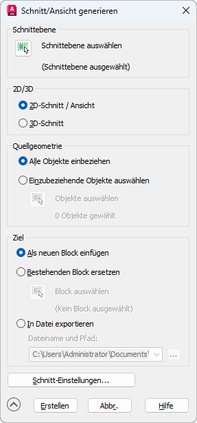 Fügt den erzeugten Schnitt als Block in die aktuelle Zeichnung ein.