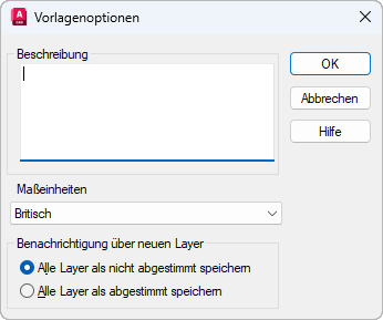 Das Dialogfeld Vorlagenoptionen wird automatisch angezeigt, nachdem Sie als Dateityp *.dwt ausgewählt, den Namen der Vorlagendatei eingegeben und auf Speichern geklickt haben.