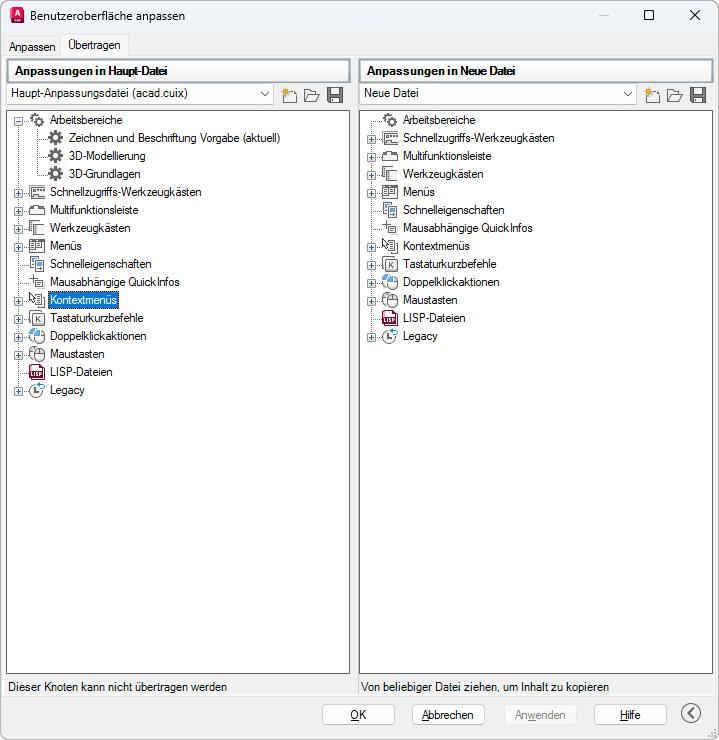 Wenn Sie in der Befehlszeile ABIIMPORT eingeben, wird die CUIx-Hauptdatei im rechten Fensterbereich angezeigt (vorgabemäßig acad.cuix für AutoCAD-Dateien oder acadlt.cuix für AutoCAD LT-Dateien). Um Daten zu übertragen, öffnen Sie die CUIx- oder eine Legacy-Anpassungsdatei im linken Bereich. Wenn Sie in der Befehlszeile ABIEXPORT eingeben, wird die CUIx-Hauptdatei im linken Fensterbereich angezeigt. Um Daten zu übertragen, öffnen Sie die CUIx- oder eine Legacy-Anpassungsdatei im rechten Bereich.