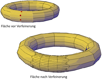 Sie können, wie in der vorigen Abbildung dargestellt, ein ganzes Netzobjekt oder eine bestimmte Fläche verfeinern. Eine verfeinerte Fläche wird in vier Teilflächen zerlegt, und die angrenzenden Flächen werden leicht verformt, um sich der Änderung anzupassen.