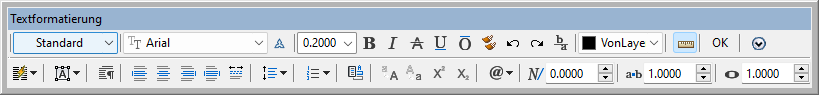 Der Werkzeugkasten Textformatierung wird immer angezeigt, wenn Sie ein MText-Objekt erstellen oder bearbeiten. Dieser Werkzeugkasten ist nicht für einzeiligen Text verfügbar.