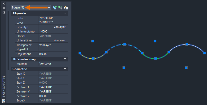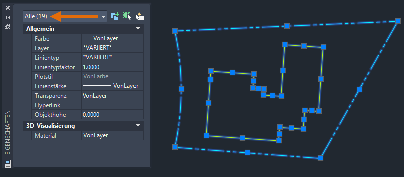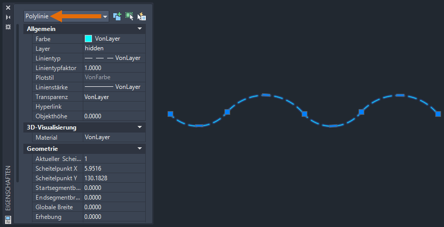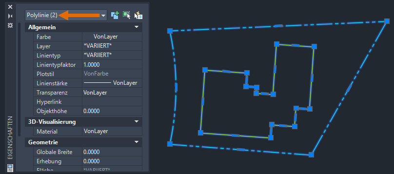 Wenn ich jetzt die fortlaufende Linie auswähle, wird sie in der Eigenschaftenpalette als Polylinienobjekt angezeigt.