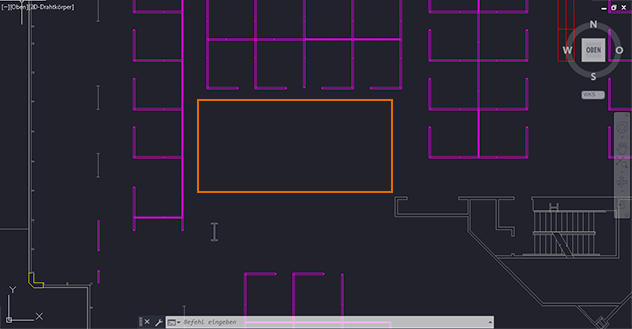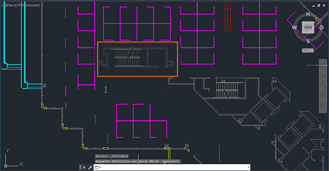 Die Treppe wird unter Verwendung der ursprünglichen Koordinaten aus der vorherigen Zeichnung in die Zeichnung eingefügt. Dies ist eine hervorragende Möglichkeit, die Geometrie beim Kopieren von Objekten von Zeichnung zu Zeichnung aneinander auszurichten.
