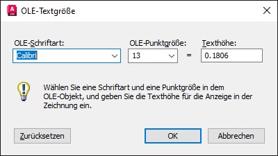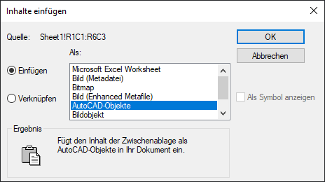 Diese Tabelle ist in die AutoCAD-Zeichnung eingebettet und nicht mit der ursprünglichen Excel-Tabelle verknüpft. Änderungen an der Excel-Tabelle werden nicht im eingebetteten Objekt in AutoCAD übernommen. Weitere Informationen zum Verknüpfen von Tabellendaten in AutoCAD finden Sie unter Datenverknüpfungs-Manager.
