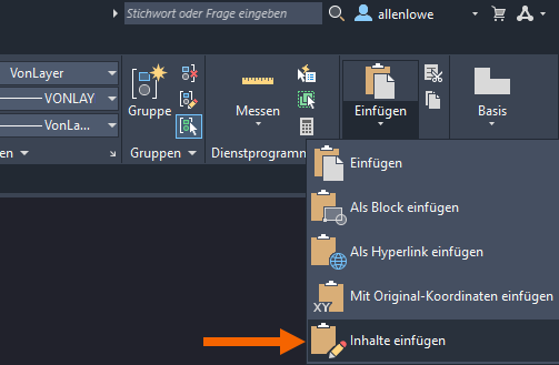 | ORIGEINFÜG | Fügt Objekte aus der Zwischenablage in die aktuelle Zeichnung ein, wobei die Koordinaten der Originalzeichnung verwendet werden. |