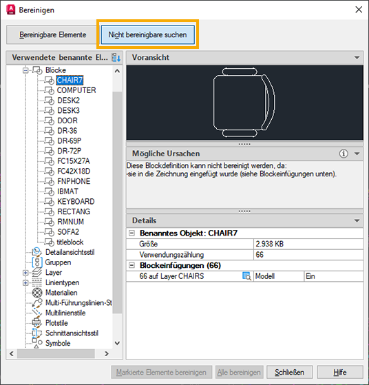 Möglicherweise möchten Sie ein Element bereinigen, es wird jedoch nicht in der Liste Nicht verwendete benannte Elemente angezeigt. Verwenden Sie die Liste Nicht bereinigbare Elemente suchen, um benannte Elemente anzuzeigen, die in der Zeichnung verwendet werden.