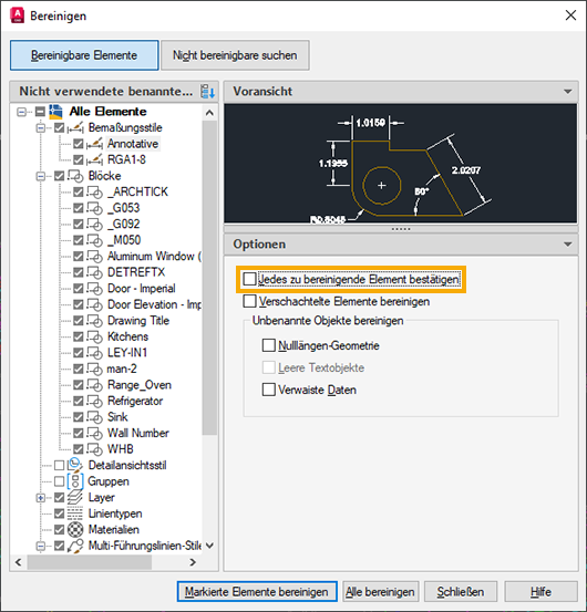 Mit dem Befehl Bereinigen können nicht verwendete Elemente oder benannte Objekte wie Blockdefinitionen und Layer aus der Zeichnung entfernt werden.