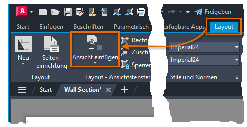 1. Klicken Sie in der Multifunktionsleiste auf die blaue kontextabhängige Registerkarte Layout. Klicken Sie dann auf Ansicht einfügen, Neue Ansicht.