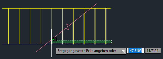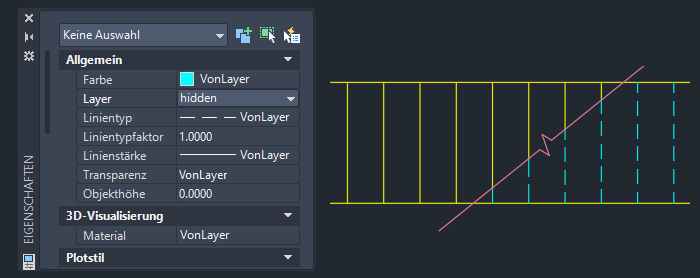Wählen Sie mithilfe eines Kreuzen-Fensters die sechs Linien rechts neben der Bruchlinie aus, und ändern Sie den Layer in hidden.
