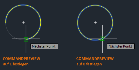 Stellen Sie sicher, dass die Systemvariable COMMANDPREVIEW auf 1 gesetzt ist. Wenn die Befehlsvorschau aktiviert ist, wird eine Voransicht der Ergebnisse angezeigt, während Sie einen Befehl verwenden.