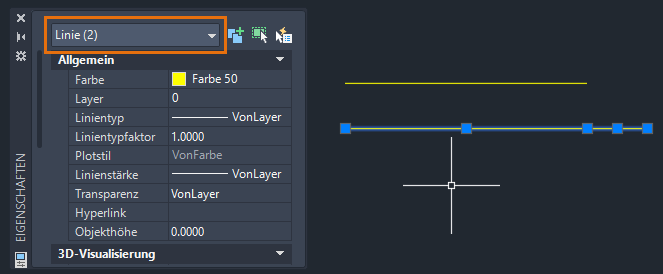 In der Dropdown-Liste Objekttyp oben in der Eigenschaftenpalette wird Linie (2) angezeigt.