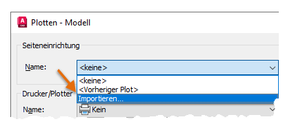 Stellen Sie sicher, dass Sie sich im selben Bereich (Modell oder Layout) wie die Seiteneinrichtung befinden, die Sie importieren möchten.