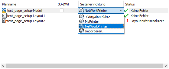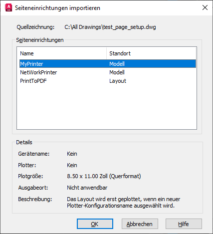 Anmerkung: Sie können die Anzahl der Schritte zum Importieren von Seiteneinrichtungen reduzieren, indem Sie die benannten Seiteneinrichtungen zu Ihren Zeichnungsvorlagendateien hinzufügen. Anschließend sind sie automatisch für alle neuen Zeichnungen verfügbar, die auf diesen Vorlagen basieren.