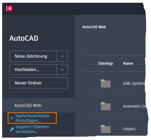 Die folgenden externen Cloud-Speicheranbieter werden von der AutoCAD-Web-App unterstützt. Wenn Sie also Ihre DWG-Dateien bereits in der Cloud speichern, können Sie problemlos darauf zugreifen und sie bearbeiten: