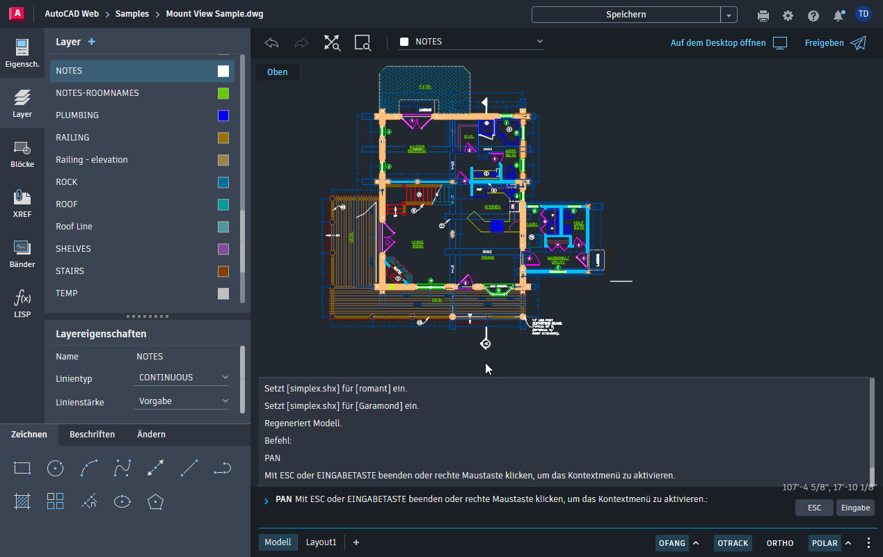 Mit der AutoCAD-Web-App sind Sie nicht mehr an einen bestimmten Computer gebunden. Eine Softwareinstallation ist nicht erforderlich, da die Software online in einem Webbrowser wie Chrome oder Firefox ausgeführt wird. Die Benutzeroberfläche sieht ähnlich aus wie die der AutoCAD-Desktop-Version und verfügt über Eigenschaftengruppen, ein multifunktionsleistenähnliches Werkzeug und eine Befehlszeile.
