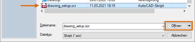 5. Wählen Sie im Textfeld Dateiname den Vorgabetext aus, und geben Sie drawing_setup.scr ein.