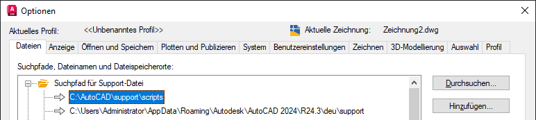 Anmerkung: Sie können die Ordner für die AutoCAD-Einstellung Suchpfad für Support-Datei auf der Registerkarte Dateien im Dialogfeld Optionen (Befehl OPTIONEN) verwalten. Weitere Informationen zum Hinzufügen von Ordnern zur AutoCAD-Einstellung Suchpfad für Support-Datei finden Sie unter So ändern Sie Suchpfade für Support-Dateien.