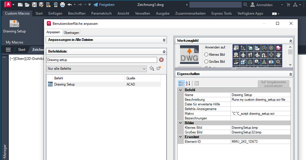 Sie können ein Makro mit dem Befehl SCRIPT definieren, um ein bestimmtes Skript über eine Multifunktionsleisten-Schaltfläche auszuführen. Im Folgenden wird gezeigt, wie ein Makro aussehen könnte, mit dem der Befehl SCRIPT gestartet und eine Skriptdatei mit dem Namen drawing_setup.scr ausgeführt wird: