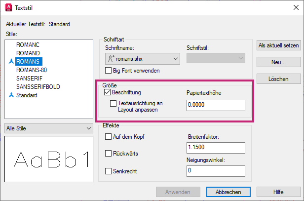 AutoCAD berechnet den Text automatisch und zeigt ihn in der erforderlichen Höhe an, basierend auf der angegebenen Papiertexthöhe und dem zugewiesenen Beschriftungsmaßstab.