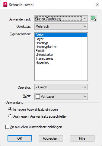 Anmerkung: Die Option Name entspricht benannten Objekten wie Blocknamen, aber auch dem Objekttyp für unbenannte Objekte wie Linien und Kreise.