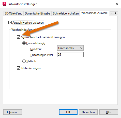 Hier sind die am häufigsten verwendeten Befehle und Systemvariablen im Zusammenhang mit der wechselnden Auswahl.