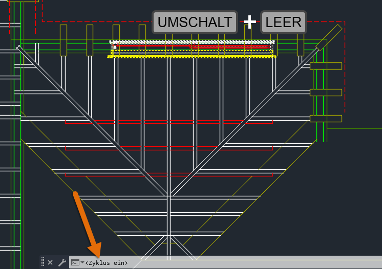 Sie wissen, dass Sie sich im Modus Wechselnde Auswahl befinden, wenn nach der Auswahl der gestapelten Objekte im Befehlsfenster <Zyklus ein> angezeigt wird.